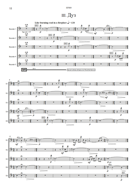 In 2012, I travelled to Sakhalin Island in the Russian Far East. Following in the footsteps of the author Anton Chekhov, I familiarised myself with the island’s colourful history. Chekhov spent some time on Sakhalin in 1890, when the island was a penal colony, and published his experiences in an enthralling travel journal (Остров Сахалин, 1895). Sakhalin is a large island and has been influenced very little by man. Taiga (тайга) dominates the scenery: a fir forest typical to the far Northern Hemisphere. For an extended period, Sakhalin was ruled obscurely by the Russians and the Japanese, but at the end of the Russo-Japanese War in 1905, the island was divided through its centre at 50°0’N. Japan ruled its southern half (Karafuto) until the end of World War II when the whole island became Soviet Union-owned. The last movement refers to the village Due (Дуэ), which used to house the first official Russian settlement on Sakhalin and is currently in an incredibly dilapidated state. A tape part accompanies the recorders, and two speeches from WWII are heard: In June 1941, the Soviet Union’s premier Molotov informs his citizens about the Nazi German attack and the Soviet Union’s engagement in the war. The second voice on the tape belongs to Emperor Hirohito, who is announcing to his subjects Japan’s surrender in August 1945. TR, 2013