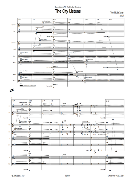 The City Listens is about stopping and quieting down amid busy city life. The idea came from the premiere venue: a bustling department store environment. The long sustained notes by the spatially scattered choir, the sound of tam-tam and the clinking of triangles bring to mind a ritualistic ceremony in which a busy city shopper is invited to take part for a moment. TR, 2007